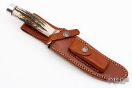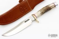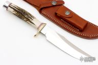 This Model 12-6 Little Bear Bowie by Randall Made Knives features a satin finished blade with notched thumbrest and sharpened top edge, .211" blade stock and 1.255" blade depth, hidden tang construction. The handle has a nickel silver guard and duaralumin butt, stag grip with red/white/blue spacers. Comes with a brown leather sheath. Excellent condition.
