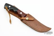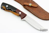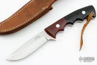 This custom knife by Keith Murr features a satin finished blade with a fileworked thumbrest, .133" blade stock, 1.024" blade depth, full tang construction. The handle has dovetailed brown linen micarta bolsters, black linen micarta scales with red liners. Comes with a brown leather sheath, not original, but fits ok. Has some scratches, otherwise good condition.