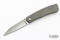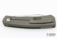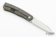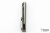 This Canibl by Suprlativ Knives features a hand rub satin finished blade with a notched front flipper. The handle has a dark bead blast finish titanium frame, titanium pivot collar, titanium backspacer with lanyard pin and tip up clip with hidden screws. Rides on bearings, nice detent, lockup and blade seating. Has stainless lockface insert. Comes with original box. Excellent condition.