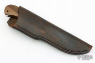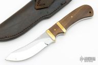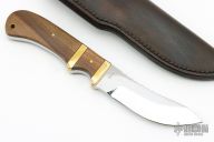 This knife by Bruce Gillespie features a mirror finished blade with fileworked spine, .198" blade stock and .983" blade depth, full tang construction. The handle has a brass guard and sub-hilt, wood scales with black liners, brass pins and lanyard tube. Comes with a brown leather sheath. Has some light scratches and small oxidation spots, otherwise good condition. #4011