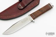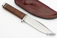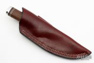 This knife features a satin finished VG10 laminated steel blade in convex grind and hidden tang construction. Blade is .196" thick and 1.153" deep. The handle has a stainless steel guard, stacked leather handle with black, red, and white spacers, and an aluminum butt cap. Comes with a red leather sheath. Has scuffs and scratches, good user condition.