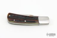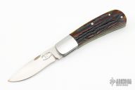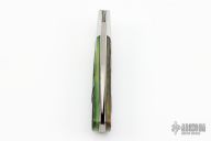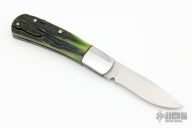 This slipjoint by Jeff Cover features a hand rub satin finished blade with nail nick. The handle has dovetailed stainless steel bolsters, green jigged bone covers with black liners. Has halfstop. Has some scratches, otherwise good condition.