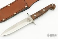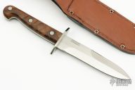 This Aussie Bowie by EK Knives features a satin finished blade, .150" blade stock and 1.158" blade depth, full tang construction, with top edge sharpened. Has stainless steel guard and walnut scales. Comes with a brown leather sheath and original box. Excellent condition.