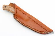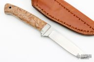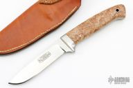 This Hunter from W.G. Stegner features a hand rub satin finished blade with .133" blade stock and .894" blade depth, full tang construction. The handle has stainless steel bolsters, maple burl scales with stainless steel pins and lanyard tube in pommel. Includes leather sheath with belt loop. Has a couple light scratches, otherwise excellent condition.