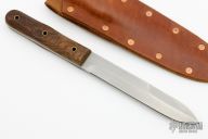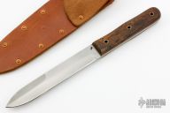This Ek Style Fixed Blade by Jeff Morgan features a hand rub satin finished blade with a false top edge, .148" blade stock and .965" blade depth, full tang construction. The handle has walnut scales with brass rubes. Comes with brown leather sheath. Has a couple light scratches, otherwise excellent condition.