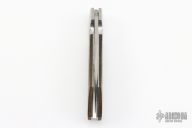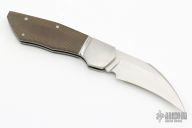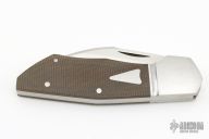This Armory Division Wharncliffe slipjoint from Joel Chamblin and JVO Designs features a hand rub satin finished blade with nail nick. The handle has fluted stainless steel bolsters, green canvas micarta covers, stainless steel liners and spring. The spring is flush in the closed, half stop, and opened position. Blade is centered when closed. This gorgeous piece was designed by JVO designs and skillfully executed by Mr. Chamblin. Excellent condition. Comes with a zippered case.