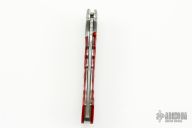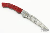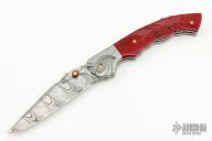 This full custom linerlock by Laurent Doussot features a Damasteel blade with carved spine and ricasso, single red coral thumbstud with a gold plated screw. The handle has matching carved Damasteel dovetailed bolsters, carved red coral scales with gold plated screws, stainless steel liners, fileworked stainless steel backspacer. Nice lockup and blade seating. Excellent condition. Comes with a zippered case.