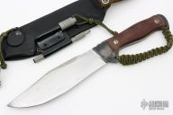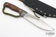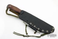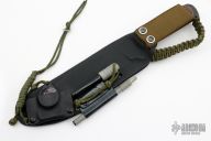 This large fixed blade features a clip point blade with mirror polished grinds and Acid Patina finished flats with a notched thumb rest. 1/4" blade stock and 2 1/8" blade depth, full tang construction. The handle has brown canvas micarta scales and a hand tied MIL-SPEC para-cord D-Guard. The handle is hollowed out on the inside for storage of survival items. The sheath is kydex with MIL-SPEC belt loop for tactical belts up to 90mm wide. This sheath also houses an array of accessories: FERRO ROD with 6061 aluminum handle in bead blast finish, Diamond plated sharpening rod, SILVA compass/thermometer combination tool, and a washer to be used for removing handle scales. Has a few light sheath scratches on the blade, doesn't apear to have been used. Excellent condition. Blade Steel: Swedish 0-1 Tool Steel