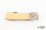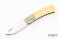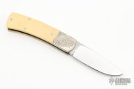This Slipjoint folder by Phil Boguszewski is marked #3 of 12 knives made for the Cascade Blade Association. It features a polished blade with nail nick. The handle has engraved nicikel silver bolsters, ivory paper micarta scales, nickel silver liners, stainless steel spring. Excellent condition. Engraved by Pat O'Brien. This knife was made in 1981-1982