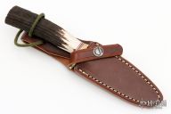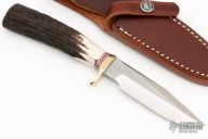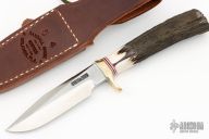 This Model 5-4 by Randall Made Knives features a clip point satin finished blade with false top edge and a notched thumbrest, .150" blade stock, .950" blade depth, hidden tang construction. The handle has a brass guard and stag grip with red/white/blue spacers. Includes a brown leather sheath. Comes with original paper wrapping. New from maker.