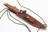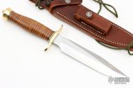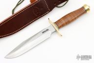 This Model 1-7 from Randall Made Knives features a satin finished clip point blade with sharpened top edge, .212" blade stock and 1.258" blade depth, hidden tang construction. The handle is comprised of a brass guard and butt, black/brass spacers, and a stacked leather grip. Comes with brown leather sheath and original paper wrapping. New from maker.