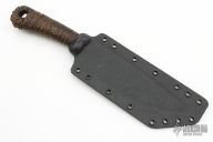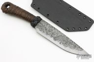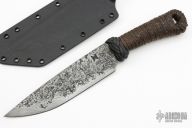 This knife by James Helm features a hand forged blade, .213" blade stock and 1.782" blade depth, hidden tang construction. The handle has a paracord/hemp wrap that has been epoxied. Comes with a kydex sheath set up for TekLok. New from Maker at Blade Show Texas 2023.
