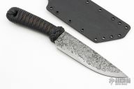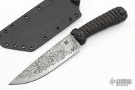 This knife by James Helm features a hand forged blade, .221" blade stock and 1.76" blade depth, hidden tang construction. The handle has a paracord wrap that has been epoxied. Comes with a kydex sheath set up for TekLok. New from Maker at Blade Show Texas 2023.