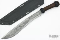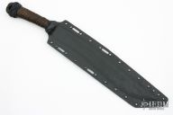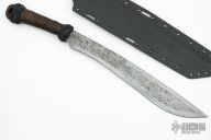 This Sinuous Bush Chopper by James Helm features a hand forged clip point recurve blade with false top edge, .206" blade stock and .178" blade depth, hidden tang construction. The handle has paracord/hemp wrap. Comes with a kydex sheath. New from Maker!