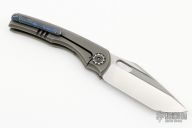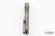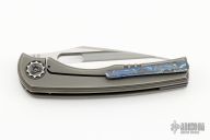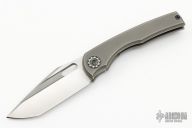 This BBM V2 by Nick Chuprin and Robert Carter features a satin finished blade with fullers, thumbhole and hand ground bevels. The handle has a titanium frame, zirconium pivot, screws, zirconium pivot collar, zircuti backspacer and tip up clip with hidden screws. Rides on bearings, nice detent, lockup and blade seating. Excellent condition.