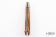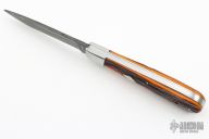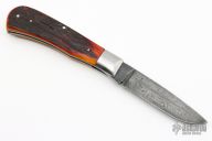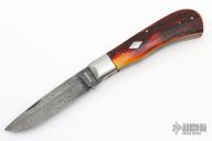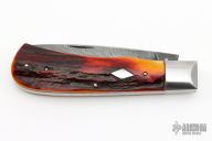 This Trapper by Burt Flanagan features a Feather Damascus blade with nail nick. The handle has stainless steel bolsters, stag covers with stainless steel escutcheon, liners and springs. Has half-stop, flush in all positions. Comes with a zippered case. New from maker at the 2023 Blade Show Texas.