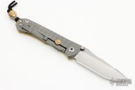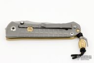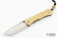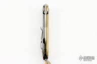 This Umnumzaan Framelock Folder by Chris Reeve Knives has a stonewashed Magnacut blade with dual thumb studs and notched thumbrest. Handle is bead blasted brass and titanium with titanium barrel spacer, titanium tip up clip, and lanyard hole. This knife has the Monkey Edge Frag Pattern. Nice detent, lockup and blade seating. Includes the original box and papers, dated September 26, 2022.  The box is damaged however the knife is in Excellent Condition.