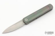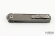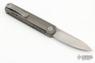 This Pup by Richard Rogers features a blasted blade with notched front flipper. The handle has a blasted titanium frame with zirconium inlays, zironium backspacer and titanium tip up clip. Rides on bearings, nice detent, lockup and blade seating. Comes with original box and COA dated November 2022. Excellent condition.