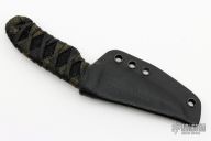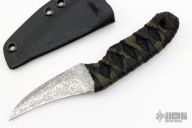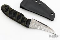 This knife by Joe Watson features a hawk bill acid etched blade with .138" blade stock and 1.090" blade depth, full tang construction. The handle has black cord wrap over a black hemp cord under wrap. Comes with a kydex sheath. New from Maker!