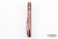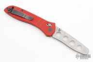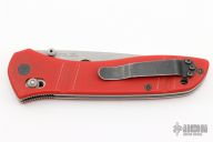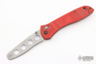 This trainer by Benchmade features a stonewashed trainer blade, notched thumbrest and dual thumbstuds. The handle has red G-10 scales over a stainless steel sub frame. Lanyard hole in pommel. The tip up steel clip can be mounted for left or right hand carry. AXIS locking mechanism. There is some ware on the pocket clip otherwise the knife is in excellent condition. Includes the original box and papers. Excellent Condition.