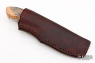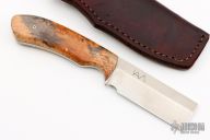 This knife by Lou Morris features a satin cleaver style blade with a full tang construction. .133" Blade Stock. 1.166" Blade Depth. The handle has box elder burl scales. Includes a brown leather sheath. Excellent Condition.