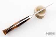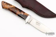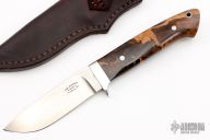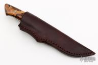This knife by Tom Buckner features a satin finished drop point blade with a tapered tang construction.  .173" Blade Stock.  1.043" Blade Depth.  The handle features a steel guard with spalted maple scales.  Includes a dark brown leather sheath. Excellent Condition.