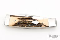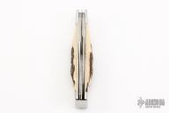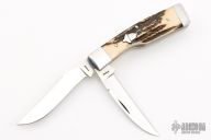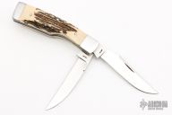 This Two-Blade Gunstock by John Howser features hand rubbed satin finish blades with nail nicks. The handle has stainless steel bolsters with integral liners, stag covers with a stainless steel acorn escutcheon, stainless steel springs. Has half-stops. Has some light scratches, otherwise excellent condition. Comes with a leather pouch.