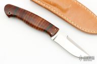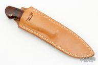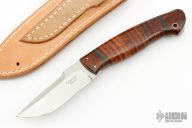 This custom hunter by Takamoto T. features a hand rubbed satin finished blade with a false top edge, CV-134 steel, .156" blade stock and .941" blade depth, hidden tang construction. The handle has a desert ironwood burl and stacked leather handle with green spacers and a lanyard hole. Comes with a brown leather sheath. Excellent condition.