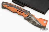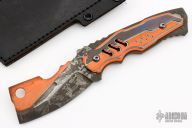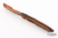 This Butcherling by TASKnives features an acid etched SuCo blade (equivalent to N690) with a notched thumbrest and false top edge, .215" blade stock and 1.291" blade depth, full tang construction. The handle has layered titanium scales. Comes with black leather sheath. 60-61HRC. New from maker at the 2023 Texas Blade Show!