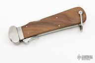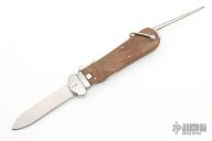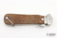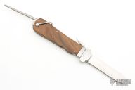 This Gravity Knife features a satin finished blade. The handle has a stainless guard, wood scales, steel liners and backspacer, marlin spike on the spine. Has a couple light scratches otherwise excellent condition.