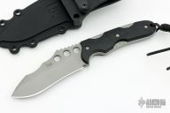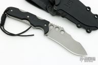 This Snody by Heckler & Koch features a bead blast finish blade with notched thumbrest, .149" blade stock and 1.36" blade depth, full tang construction. The handle has black scales. Comes with a kydex sheath. Has some light scuffs, otherwise excellent condition.