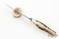 "I started making knives in 1986 when Bill Harsey invited me to work with him in his shop. I attended my first knife show in 1987 where I won Best New Maker award at the OKCA show. After that I was hooked, I spent as much time in the shop as I could and made a point of attending a show every few months. Unfortunately, life got busy in the early 90's and I put shows on the back burner. I continued to make knives for local customers and the slower pace allowed me to focus on improving the quality of my work. I was fortunate to live in a location with several accomplished makers. The three who helped me the most were Bill Harsey, Bob Lum and Ron Lake. Every knife I make reflects something I have learned from these three makers and I am grateful for their willingness to share their hard earned expertise. In 2005 I retired from a career in law enforcement and was able to realize my long time dream of making knives on a full time basis." Thad is the father of Zac Buchanan.