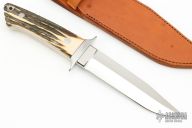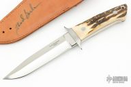 This Wilderness by Thad Buchanan features a mirror polished blade with a sharpened top edge, satin stainless fittings, and stag scales with red liners, .255" stock. 1.252" blade depth, full tapered tang. Excellent fit and finish. Comes with a brown leather sheath. Excellent condition.
