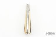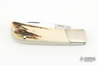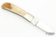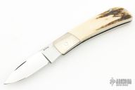 This slipjoint by Leon Pittman aka "Worm" features mirror polished drop point blade with a nail nick. The handle has dovetailed nickle silver bolsters, stag covers, stainless steel liners and spring. Has half-stop. Has some light scratches, otherwise excellent condition.