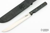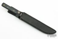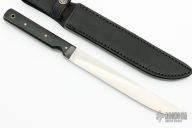 This Model 10 Salt Fisherman and Household Utility features a satin finished upswept blade with notched thumbrest, .114" blade stock and .852" blade depth. The handle has black linen micarta scales with brass pins over full tang construction. Brass lanyard tube with lanyard in pommel. Includes a black leather sheath. Excellent condition.