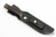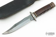 This S1 Bowie (Vietnam 5th Special Forces Group) has a black coated clip point blade with hidden tang and double guard. Blade width is just under 1/4", depth 1-1/4". Handle is contoured stacked leather with white spacers, black coated steel butt cap and lanyard hole. Comes with a black leather sheath. Very Rare. Blade is marked "SOG SPECIALTY KNIVES" on the presentation side. The non-presentation side has the Special Forces crest on the ricasso and "VIETNAM 5th Special Forces Group" on the swedge. Has scuffs and scratches, has been used and sharpened, otherwise good condition.