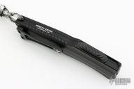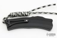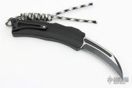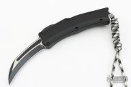 This ROC by Heretic Knives features a two tone DLC coated blade with fullers and notched thumbrest. The handle has a black aluminum chassis with a tip down DLC titanium clip with ceramic ball. Textured push button. Comes with original box. Has a couple light scuffs, Excellent condition otherwise.