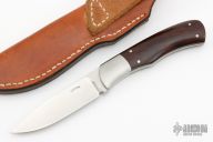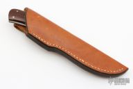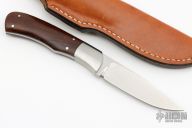 This Hunter by Ron Gaston features a hand rubbed satin finish blade with .175" black stock and .853" blade depth, full tapered tang construction. The handle has a stainless steel dovetailed bolsters, ironwood scales. Comes with a brown leather sheath. Has some light scratches, otherwise excellent condition.