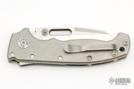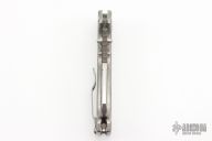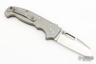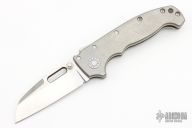 This AD20 by Andrew Demko features a hand ground hollow satin finished blade with notched thumbrest, thumbhole and dual thumbstuds.  The handle has a stonewash titanium frame with a tip up anodized titanium clip and "Shark" lock release on the spine. Comes with zippered case. Has some marring on the hardware, excellent condition otherwise.