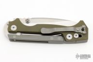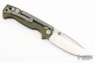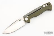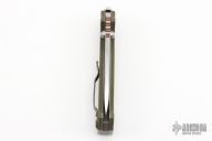 This Custom AD-15 from Andrew Demko features a drop point satin finished blade with swedge, dual thumb studs and notched thumbrest. The handle is comprised of textured green G-10 scales, bead blasted titanium frame with a reversible titanium tip up clip and tumbled titanium backspacer. This knife features a unique "Top Lock" style locking mechanism. Has some light marring on the hardware, and some light scuffs and scratches. Great condition otherwise.