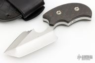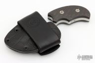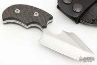 This Tactical Badger is a collaboration between Reese Weiland and Joe DeJesus features a hand rub satin finished blade with sharpened top edge, .244" blade stock and 1.530" blade depth, full tang construction. The handle has red/black carbon fiber scales with titanium hardware. Comes with a black leather over felt lined kydex sheath by Freddy Ramos Leather. Comes with a zippered case. New from maker.