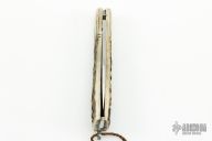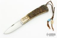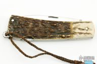 This lockback by WS (please let us know if you know who this is) features a mirror polished blade with nail nick. The handle has stag covers with steel backspacer and lanyard hole at the butt. Has some scratches, otherwise good condition. Comes with a zippered case.