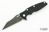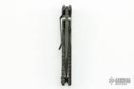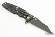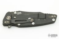 This Eklipse Flipper by Rick Hinderer Knives features a 3.5" battle black DLC finished blade, notched thumbrest and flipper, dual thumbstuds. The handle has a black MEFP G-10 scale, and battle black titanium handle/clip. Clip can be mounted for tip up or down carry. Nice lockup, seating, and detent. Comes with original box and extra hardware. New condition.