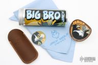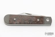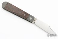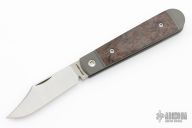 This Big Bro Jack slipjoint model by Jack Wolf Knives features a satin finished clip point blade with nailnick. The handle has integral bead blast finish pinched and fluted titanium bolsters and liners, Fat Carbon scales with a stainless spring. Comes with box, metallic tube with Sean Tiffany artwork, leather slip, sticker and microfiber cleaning cloth. New from Maker!