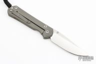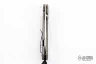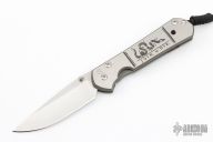This Large Sebenza 21 CGG "Join or Die", by Chris Reeve Knives features a stonewashed blade with single titanium thumbstud, notched thumbrest. The frame is bead blasted titanium with matching tip up clip; the front scale is satin finished with the computer generated graphic. Nice detent, lockup and blade seating. Comes with original box, sheath and papers dated November 21, 2018. Excellent condition.