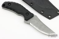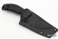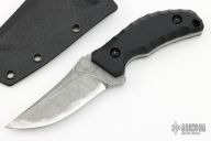 This Ginan by Kiku Matsuda features an upswept blade with false top edge with notched thumbrest, .176" blade thickness and 1.231" blade depth, full tang construction. The handle has black G-10 scales. Comes with kydex sheath. Excellent condition.