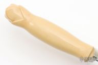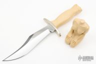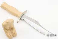This Bare Bowie by Robert Rippy features a mirror polished blade with a nearly sharpened top edge, .245" blade stock and 1.562" blade depth, hidden tang construction. The handle has a nickel silver guard, hand carved ivory paper micarta grip that was carved by Robert's wife Bonnie Rippy with a woman's face. Comes with a hand carved ivory paper micarta stand that is the rest of the woman's bare body. Marked "0" on the blade. Underside of handle has some light cracks. Has a few light scratches, otherwise excellent condition.