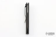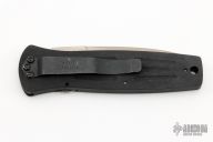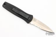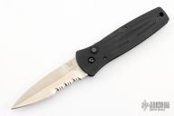 This 3550 Mel Pardue designed side opening auto from Benchmade has a satin finished spear point partially serrated blade with a false top edge. Handle is matte black finished aluminum with milled contours, spine-thumb safety button, black stainless steel tip down clip, and lanyard hole. Has a few light scuffs and scratches, otherwise excellent condition.