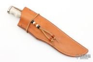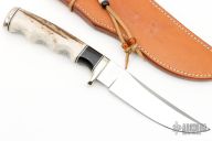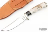 This hunter by RJ Knives features a satin finish blade, .156" blade thickness and 1.084" blade depth, hidden tang construction. The handle has a nickel silver guard and butt, stag grip and red/black/wood spacers. Comes with brown leather sheath and a zippered case. Excellent condition.