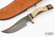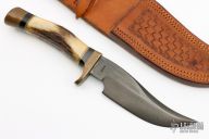 This skinner from G.W. Stone features a blued blade with false top edge, .248" blade stock and 1.480" blade depth, hidden tang construction. The handle has a brass guard and butt with lanyard hole, stag grip with black and brass spacers. Stamped "SC105". Comes with a hand tooled brown leather sheath and a zippered case. Has some patina, otherwise good condition.